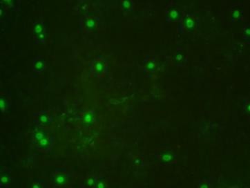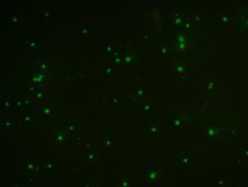 如待检细胞孔出现特异性胞核内黄绿色荧光,判为阳性(阳性荧光图片附后)。否则,判为阴性。